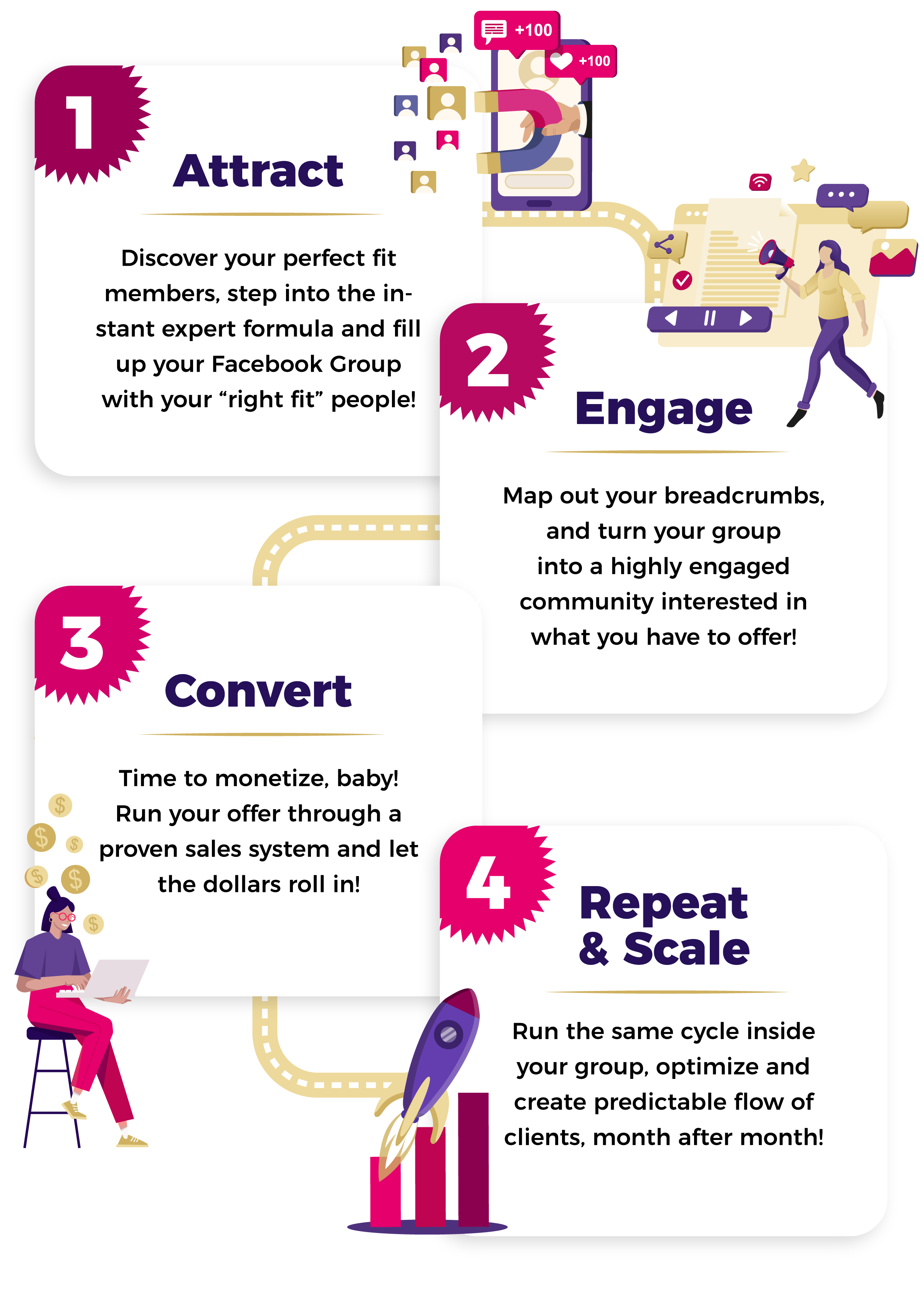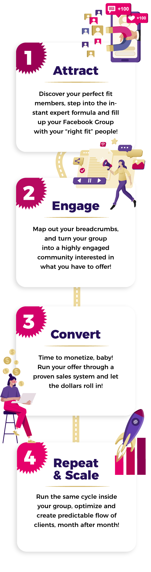 …by mastering a simple step-by-step system to easily attract, engage and convert hundreds (thousands!) of your ideal customers inside your free Facebook group – without stress, overwhelm or “icky” sales tactics …